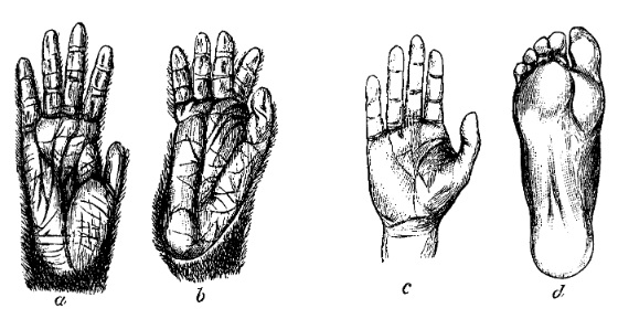 Edward Tylor, dans son Anthropology de 1881 pousse cette observation un peu plus loin. Afin de démontrer l’idée désormais familière qui veut que la différenciation entre la main et le pied soit bien plus prononcée chez l’humain que chez le singe, il nous présente une image sur laquelle les mains et les pieds d’un chimpanzé et d’un humain sont placés côte à côte.