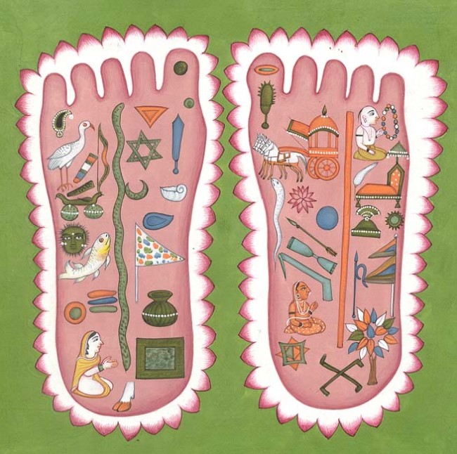 Dans la tradition hindoue, les pieds de Vishnu sont également décorés de nombreux symboles qui représentent l’unité de l’univers, ou encore l’harmonie au sein du corps :