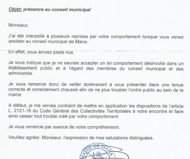 Autres tropiques, même problème. A Mana en Guyane, petit exemple amusant d’un maire dérangé par ces pieds libres venant troubler l’ordre public :