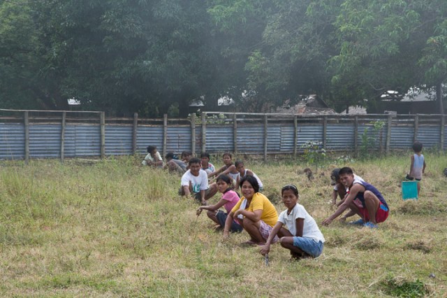 Parents d’élèves Tagbanua coupant l’herbe de la cour de l’école, Philippines © Camille Oger / lemanger.fr