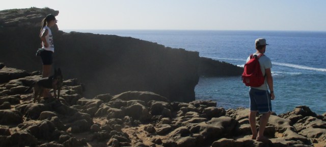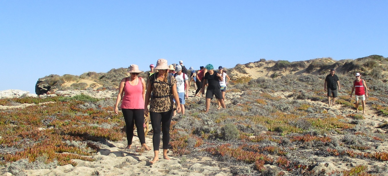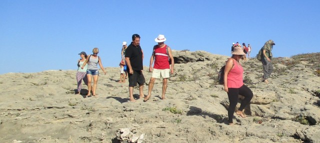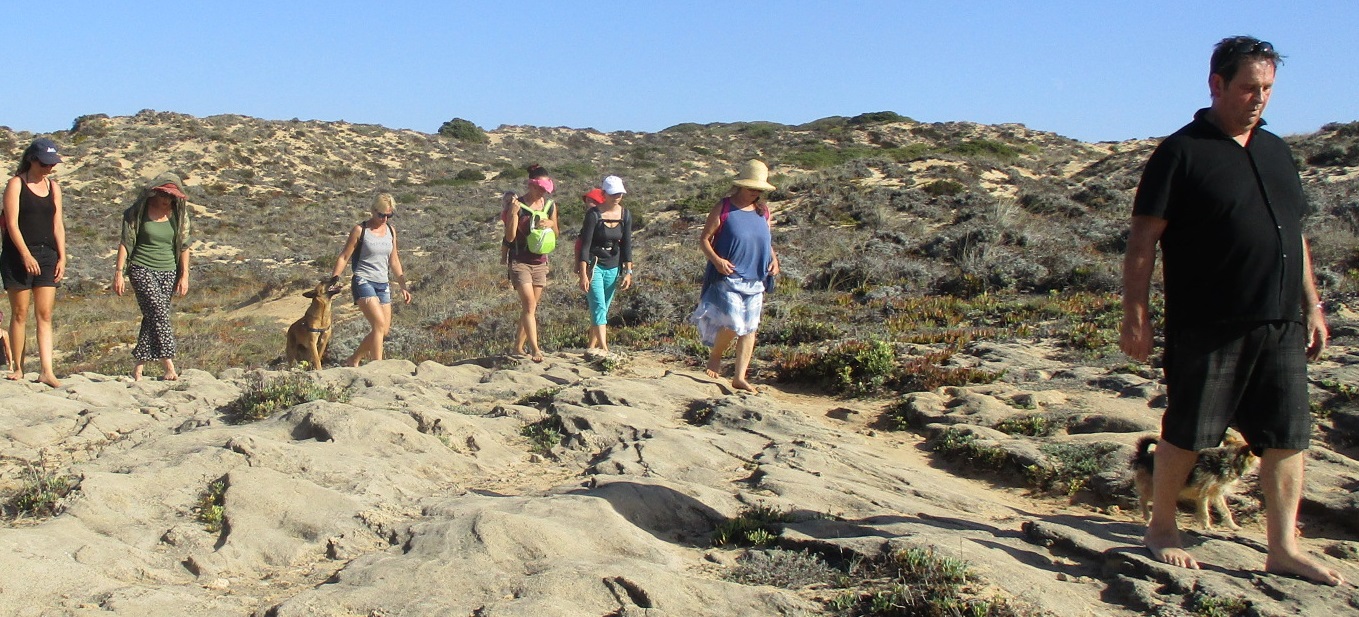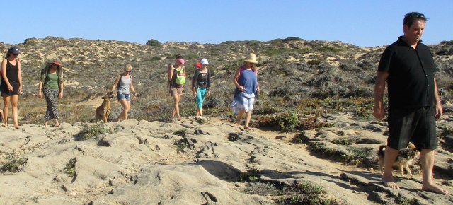 Petite promenade le long des falaises. 25 personnes, 12 nationalités (Lettonie, Brésil…), 3 chiens. Sans protection aux pieds, c’est une nouvelle dimension qui s’est imposée à nous, un nouveau monde de sensations qui s’est offert à nous. Le choix d’un rapport plus honnête au corps et au monde, le choix de règles du jeu plus authentiques. Granit, herbes, humidité, rayons du soleil, vent, chaud, froid. Plaisirs sensoriels, mais également légères douleurs, parfois, lorsque le pas se faisait trop maladroit, l’équilibre défaillant, la fatigue grandissante. Les enfants les plus jeunes, encore peu conditionnés par les attributs modernes (chaussure, chaise) ont évolués en toute aisance et fluidité, même sur les revêtements les plus coriaces (arénite).