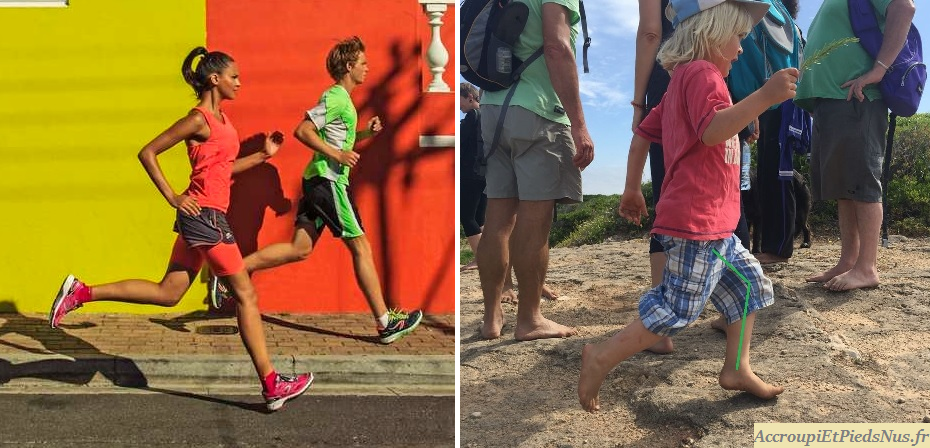 Contrairement au coureur moderne, Moritz (à droite) – qui a grandi sans chaussures – fait preuve d’une technique précise, délicate, saine, naturelle et efficiente. La sensibilité du pied lui rappelle à chaque instant toute l’importance du genou fléchi.